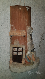 Antica tegola in terracotta, detta anche coppo, decorata a mano raffigurante un'antica lavandaia.