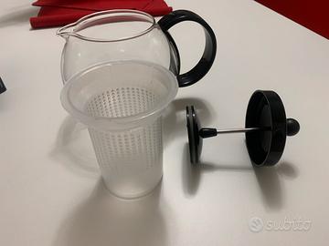 Teiera a pressofiltro marca Bodum, 1 lt. in vetro con cestello, coperchio, manico e stantuffo in plastica, completa di scatola. Mai usata