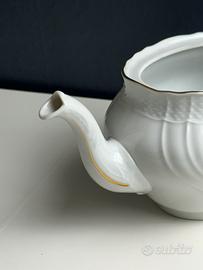 Elegante teiera originale Richard Ginori in porcellana bianca lucida, modello Vecchio Ginori con bordo oro, caratterizzata da raffinate lavorazioni a rilievo e linee mosse di gusto classico.