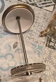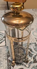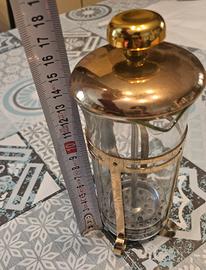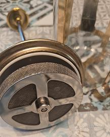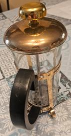 Elegante caffettiera in vetro con dettagli dorati e manico nero. - Struttura in vetro trasparente. - Cornice e coperchio in metallo color oro. - Manico in plastica nera. La teiera/caffettiera con filtro a pistone è davvero molto comoda. Si versa l’infuso direttamente in acqua e dopo il tempo necessario premendo il filtro verso il basso, separerà l’infuso dall’acqua.
