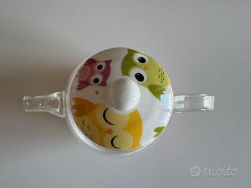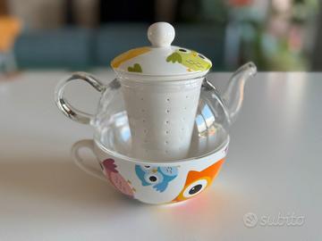 Set da tè Brandani con teiera, tazza e filtro, decorato con simpatici gufi.