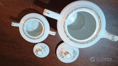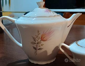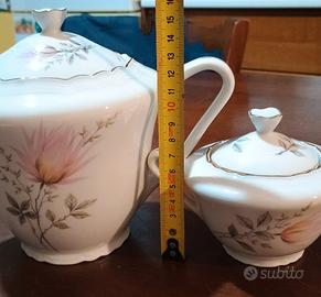Teiera e zuccheriera in porcellana bianca con stampe fiori e bordo dorato . vintage senza segni di usura.
