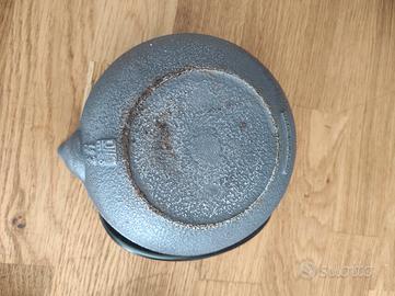 Teiera giapponese in ghisa con rivestimento interno smaltato, manico in metallo. Con filtro, coperchio e appoggio da tavolo sempre in ghisa completo di copri piedini in plastica. Made in Japan, in buone condizioni, un po' di ruggine sulla ghisa del fondo esterno della teiera e dell'appoggio.