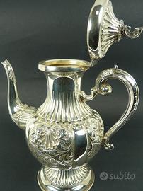 Raffinata ed elaborata teiera in argento massiccio 800. Completamente lavorata a mano a sbalzo a bassorilievi con motivi floreali, foglie d'acanto e conchiglie marine.
