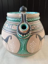 Bellissima teiera vintage in ceramica fatta e dipinta a mano dalle sapienti mani dei maestri artigiani della fornace ARS artigiana - Deruta - Italy .Bellissimo decoro che rappresenta cavalli neri stilizzati . Anni '50/'60 , in buono stato , con piccolissimi segni di usura, piccola sbeccatura all'interno del coperchio. Allargare bene le fotografie per verificare lo stato di conservazione e le misure. Peso grammi 600 circa.