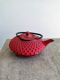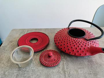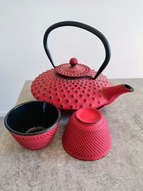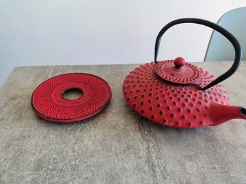 Vendo teiera in ghisa colore rossa, stile giapponese. Completa di appoggio e due tazzine abbinate.