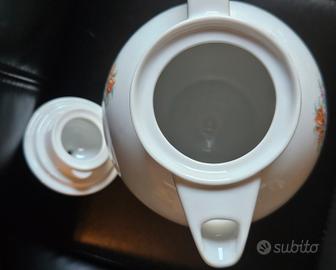Bellissima teiera in porcellana, nuova e finemente decorata con motivi floreali multicolori e piccole dorature. Ideale per una tavola elegante. Perfetta per il tè o altre bevande. Altezza (con coperchio) cm 21. L'articolo verrà imballato con la massima cura.
