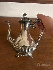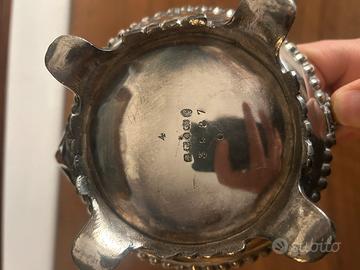 Teiera antica in Sheffield plate risalente al periodo di transizione tra lo stile Regency e quello vittoriano, databile intorno alla seconda meta del 800 e realizzata in Inghilterra. Questo elegante oggetto d’epoca rappresenta perfettamente il gusto raffinato della metà del XIX secolo, con linee sobrie ma armoniose tipiche del passaggio tra due importanti correnti stilistiche. La teiera conserva i punzoni originali dell’epoca, elementi fondamentali che ne attestano autenticità e provenienza. I marchi presenti indicano chiaramente che si tratta di Sheffield plate antico e non di argento massiccio. Per chi non lo conoscesse, lo Sheffield plate è una particolare tecnica sviluppata in Inghilterra nel XVIII secolo che consiste in una lega metallica in cui lastre di argento vengono fuse e laminate su un’anima interna in rame o ottone, creando un oggetto molto particolare. Un ulteriore elemento di interesse è che questa tipologia di teiera è documentata anche in pubblicazioni inglesi dedicate alla storia dello Sheffield plate, come visibile nelle immagini allegate, a conferma del suo valore storico e collezionistico. Prezzo: 70 euro. Non è prevista spedizione: il ritiro avverrà esclusivamente a mano in zona Bergamo. Resto a completa disposizione per ulteriori informazioni o dettagli.