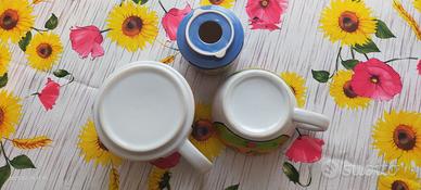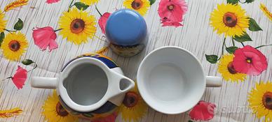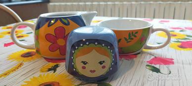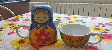 teiera raffigurante una bambolina russa , è composta di tre pezzi ,la base fa' da tazza , e la parte superiore la teiera , in ceramica ,