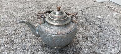 Teiera Persiana in rame e acciaio, martellata, sbalzata a mano con motivi decorativi, manico in legno con supporti metallici