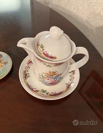 Teiera porcellana limoges francese dipinta a mano con tappo a bocciolo e piatto sempre in porcellana limoges francese dipinte a mano con decorazioni floreali e bordature d’oro. Marchio dipinto sul fondo di Limoges france paint a la men.
