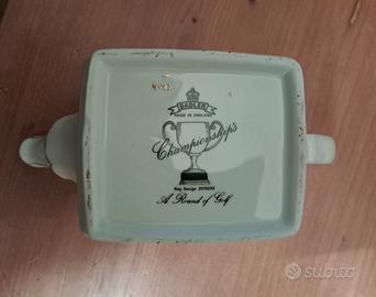 Teiera Sadler "A Round of Golf" della Championship Collection.Prodotta in Inghilterra.Presenta scene di golf dipinte su entrambi i lati e un orologio decorativo sul coperchio.Porcellana con dettagli dipinti a mano in oro su bordo, beccuccio e manico.Fuori produzione.