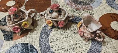 vendo Servizio vintage anni ’60 in ceramica Descrizione: Elegante servizio vintage composto da 3 pezzi: teiera, zuccheriera e lattiera. Realizzato in ceramica con splendide decorazioni floreali a rose in rilievo, molto decorative e raffinate. Il set è nuovo, mai utilizzato, sempre conservato con cura. Condizioni eccellenti, ideale sia per uso decorativo che per collezionisti di oggetti vintage. Perfetto per arredare una cucina classica, una vetrina o per chi ama lo stile retrò. Condizioni: pari al nuovo, nessun difetto. Contattami per qualsiasi informazione.