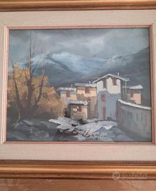 Quadro con tela paesaggio innevato ad opera del pittore C. Barbaglia. Con cornice rettangolare in stile classico in legno massello color oro e sfumature marroni. Seconda cornice bianco sporco. Con gancio. Con vetro. Certificato di garanzia applicato sul retro. Misure: esterno 43x37 cm; interno tela 24x30 cm.