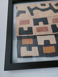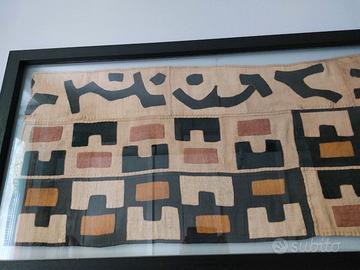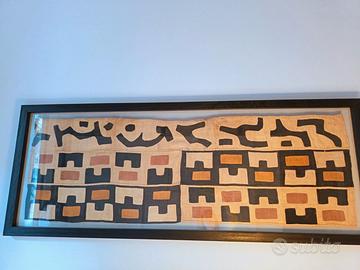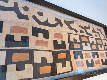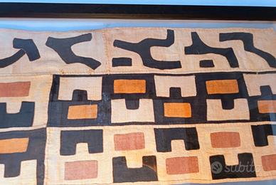 Arazzo, antico telo Kuba del Congo, in rafia cm 290 x 79 con disegni tribali. Da utilizzare come tappeto, o arazzo a completamento di una parete, dietro la testiera del letto. Ogni pezzo è unico nel suo genere, è fatto a mano con intrecci di foglie in colori diversi e naturali. Il tessuto presenta in alcuni punti dei fori che ne caratterizzano l'originalità. E' già montato con un doppio vetro e una cornice spessa in legno. Dato il peso della cornice e la delicatezza del vetro, non spedisco. RITIRO A MANO A MILANO