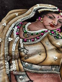 Bellissimo dipinto Batik indiano con decorazioni in paillettes colorate. Fondo nero. Per le misure vedi la foto