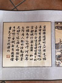 Perfettamente confezionata in tela arancione di seta, scatola in legno perfettamente conservata e borsa in tessuto con scritte.