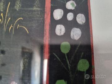 Opera decorativa realizzata su tessuto dipinto a mano, risalente agli anni ’70, di provenienza indiana. Il soggetto raffigura scene tradizionali con figure in abiti cerimoniali, motivi floreali e paesaggi stilizzati, in linea con la raffinata estetica dell’arte indiana.