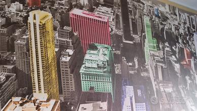 Soggetto: skyline di New York in stile pop art, bianco e nero con edifici colorati.
