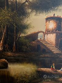 Tela di un paesaggio su un fiume con uno sfondo in cui si intravede una città
