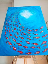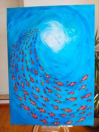 Ti trovi in fondo all'oceano, alzi lo sguardo e la luce ti aspetta, la superficie ti chiama, la voglia di respiro aumenta, un banco di pesci ti apre la strada.. Quel vortice di blu ti cattura lo sguardo fin quando non riemergi dai tuoi abissi. Questo dipinto fatto a mano(90x65 cm) dona energia, profondità e carattere a qualsiasi spazio. Un pezzo unico capace di trasformare il tuo salotto in un ambiente vivo e suggestivo. Pronto da appendere, impossibile da ignorare. #arte #dipinto #quadro #homedecor #wallart #modernart #artforsale #interiordesign #deco #decoration #artecontemporanea #peinture #decoracion #artwork #designinterno