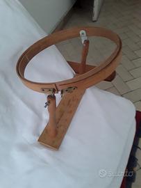 Telaio a cerchio con base in legno per ricamo, il diametro del doppio cerchio regolabile è cm.28, la base misura di lunghezza cm 34,laterale cm 7,in totale è alto cm 22, può essere poggiato sulle gambe o su un tavolo.