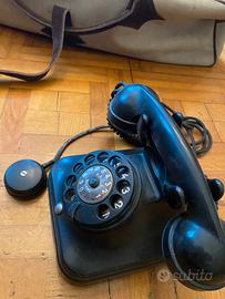 Elegante telefono a disco in bachelite nera prodotto dalla F.A.C.C. (Fabbrica Apparecchiature per Comunicazioni e Centrale) di Milano, tipico degli anni ’40-’50. Dotato di cornetta ergonomica, quadrante numerico a rotazione e campanello esterno collegato tramite cavo intrecciato. Un oggetto di design e tecnologia d’epoca, oggi molto ricercato come pezzo da collezione o arredo vintage, testimone di un’epoca in cui la comunicazione era lenta ma carica di fascino.