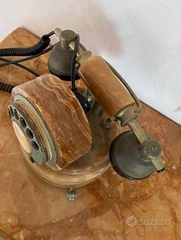 Telefono da tavolo vintage di pregio, realizzato con corpo in onice naturale e componenti in metallo brunito, dotato di disco rotante originale.