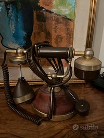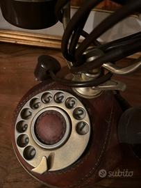 Vecchio telefono in legno con rifiniture in pelle. Originalissimo oggetto arredo .