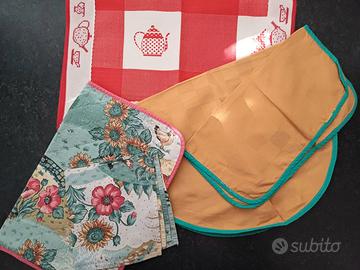 Teleria per la cucina - federe copri cuscini - strofinacci natalizi - sacchetto di tela 37x40 cm - tovaglietta monoposto con girasoli con tovagliolo coordinato - federe per cuscini - grembiule intero (fronte/retro) - tovaglietta monoposto rossa - paraspifferi- busta con tovagliolo coordinato - tovaglietta ovale ocra con tovagliolo coordinato - tutto in buone condizioni - a scelta a 2 euro al pezzo