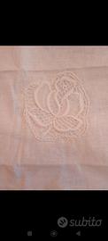Bellissimi teli ricamati, perfetti per un tocco vintage. Sono due teli in cotone bianco, con ricami floreali e delicati inserti in pizzo. Ideali per arredare con stile la tua casa. - Ricami floreali - Dettagli in pizzo - Tessuto in cotone misto lino - Ritrovamento nel baule del corredo