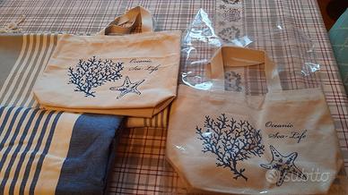 n.2 teli mare in cotone misure: mt.2,00 x cm 94 colori diversi bleu e grigio, con borsettina contenitore. Nuovi mai usati.