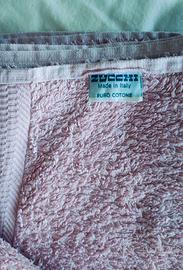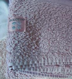 Set composto da 3 teli bagno/doccia in spugna Zucchi Solotuo: uno di colore pesca-giallo chiaro (164 x 84 cm), uno lavanda pallido (167 x 88 cm) ed uno bianco (170 x 87 cm)