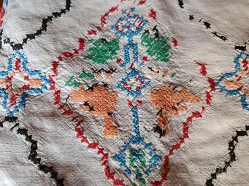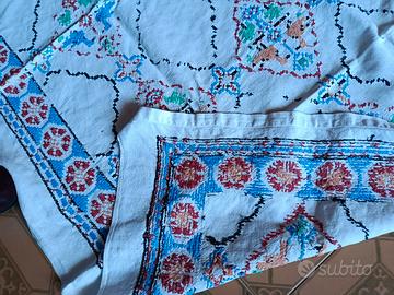 Tovaglia da tavola di tela grezza ricamata con decorazioni colorate egiziane ma si può utilizzare come tappeto o asciugamano visto che la qualità della tela è molto fresca.Bellissimi colori assortiti tra loro per cui sta bene ovunque. vi dò le misure cm. 155 x cm 120. Naturalmente nel pacco che spedisco c'è sempre un regalino
