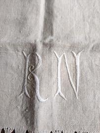Telo in tessuto lino/canapa ricamato a mano con iniziali ricamate. Misure cm. 107x68. Mai utilizzato.