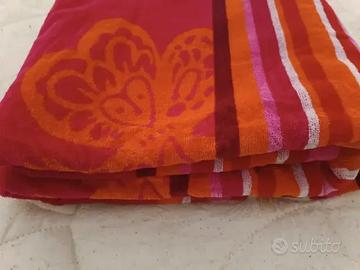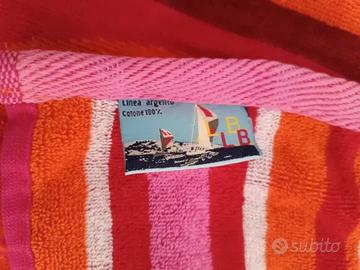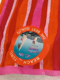 telo mare in cotone 100% egiziano extra large 180x155 cm con un vivace design a righe colorate e farfalle rosa in diverse tonalità di rosa ed arancione. Articolo mai usato ,né mai lavato ,come si può notare dall’etichetta in cartone. C’è la possibilità di acquistare uno identico con lo sconto set del 15%