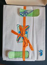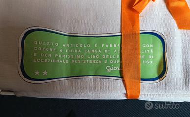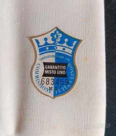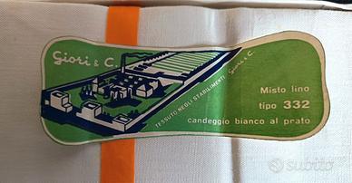 Telo in tessuto 332 con ordito cotone e trama in lino, candeggio bianco al prato, Marca Giori Giglio Azzurro. Tessuto di altissima qualità certificato. Dimensioni effettive telo 240/290 cm. Perfetto per biancheria e lenzuola. Con piccoli ingiallimenti dovuti al tempo. Nella sua confezione originale.
