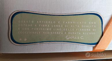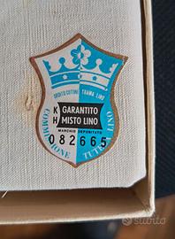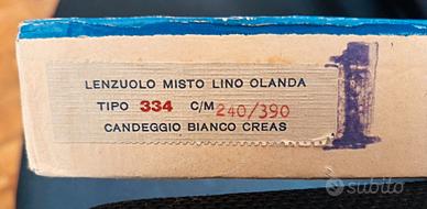 Telo in tessuto 334 con ordito cotone e trama in lino Olanda, candeggio bianco Greas, marca Giori Giglio Azzurro. Tessuto di altissima qualità certificato. Dimensioni effettive telo 240/390 cm. Perfetto per biancheria e lenzuola. Con piccoli ingiallimenti dovuti al tempo. Nella sua confezione originale.
