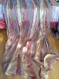 Tenda di organza e un po' di velluto a strisce colorate dal dorato al ruggine con effetti di trasparenza. Molto leggera per finestra alta e larga. Dimensioni 100 cm di larghezza (parte alta, ad anelli) e 290 di altezza. Accetto di spedire o di consegnare personalmente