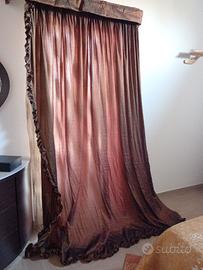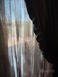 Per rinnovo arredamento vendo tenda sartoriale pari al nuovo. Doppio strato: un telo in organza con trama lavorata e il telo oscurante in "taftà". Modello con strascico. Bordura impreziosita da piccoli punti luce. Adatta ad ogni tipo di ambiente, classico o moderno.