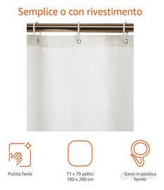 Tenda da doccia in poliestere, bianca Impermeabile Proteggi il pavimento del tuo bagno da schizzi e spruzzi con la tenda da doccia impermeabile AmazonBasics. Si può usare da sola o con una fodera protettiva adeguata e garantisce una protezione duratura e la massima privacy. Il colore bianco opaco di questa tenda si abbina perfettamente con l’arredamento circostante. Dettagli Si può usare da sola o con una fodera protettiva Bianco opaco Ganci inclusi Le dimensioni di 180 x 200 cm garantiscono una copertura completa Lavabile in lavatrice