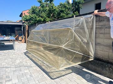 Tenda trasparente con funzione parapioggia. Da montare su un ingresso, su un finestrone, su un varco per proteggere la zona antistante da pioggia e precipitazioni. È trasparente, si può impacchettare al muro quando non serve. Altre info?
