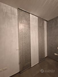 Tre pannelli materiale tecnico. Pannello centrale colore bianco coprente, i laterali fili intrecciati color argento. Misure pannello 50cm x altezza 270cm. Tenuta in perfette condizioni, come nuova, no bambini e animali in casa.