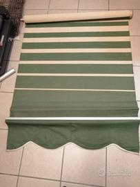 Vendo tenda da sole a caduta movimento manuale cotone pesante colore verde scuro/beige come da foto, mantovana altezza cm 23 bordata, comando tenda sole con arganello e palo a mano, corredata di placche a muro e viti., pali altezza cm 170 regolabili in altezza con braccetti a scorrere per regolare altezza. Vendo per cambio casa.