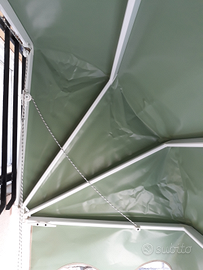 Dimensioni in cm: larghezza 162, sporgenza 80, altezza 77. Cappottina in telo in pvc che non si scolora al sole. Telaio in alluminio colore bianco. Azionamento manuale a fune con bitta di avvolgimento. Dotata di ganci per il fissaggio e tasselli con viti in acciaio inox. No spedizione.