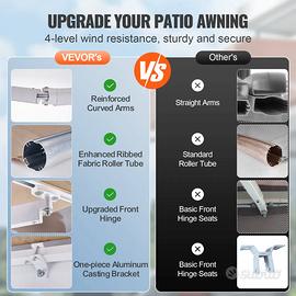 • Vendo da negozio, solo articoli Nuovi e Certificati SPECIFICHE ↓ Ombrellone per Pioggia & Sole: con una tela in poliestere da 280 g e un rivestimento in PU impermeabile, con classificazione UV80+, ti protegge dai raggi UV e ti mantiene asciutto. Si distingue per la solidità del colore e la durevolezza, ed è perfetto per rilassarsi nel tuo giardino. Costruita per Durare: questa tenda da sole retrattile manuale è dotata di robuste staffe in tubo di acciaio con maggiore durata e resistenza all'usura. I collegamenti sono fissati con viti per una maggiore stabilità e resistenza al vento (fino al livello 4). Il tubo superiore in alluminio ispessito consente alla tenda di rimanere tesa e di evitare cedimenti del telo. Si consiglia di ritrarlo durante i temporali per prolungarne la durata. Facile Regolazione dell'Angolo: basta girare la manovella per regolare l'angolo del parasole da 40° a 90° per un'ombra versatile in qualsiasi condizione atmosferica. L'operazione è semplice e pratica. Suggerimenti per l'Installazione: l'assemblaggio richiede tre persone. Altezza di installazione consigliata: 8'-12'/2,4-3,7 m. Sono inclusi un manuale e l'hardware di installazione. Si consiglia di installarlo su un muro di cemento o mattoni. Potrebbe essere necessaria una consulenza professionale a seconda del tipo di muro. Strumenti necessari (non inclusi): trapano con punta, metro a nastro e chiave inglese. Utilizzo Versatile: la tenda retrattile di livello commerciale è ideale per aziende come ristoranti, bar, mercati e magazzini, poiché fornisce ombra e protezione dalla pioggia. È perfetto anche per spazi residenziali come cortili, giardini, balconi e finestre, garantendo un relax confortevole e fresco.