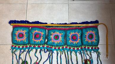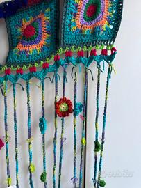 Deliziosa tenda decorativa realizzata a uncinetto con tanti piccoli fiori colorati.