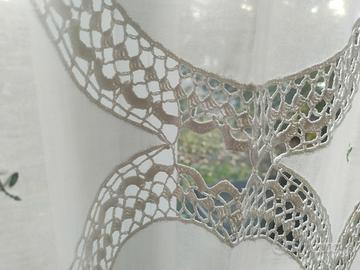 Vendo tenda fatta e ricamata a mano in cotone. Dimensioni 230x250cm (h). Con ganci e balza superiore. I cerchi di tessuto ricamati sono stati contornati a uncinetto e uniti tra loro. In due punti è saltato il filo come da foto. La balza scende posteriormente come da foto. Molto elegante