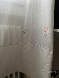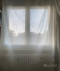 Tenda in tessuto sintetico simile al misto lino colore bianco con ricami fatti a mano e balza di 30 cm circa in fondo. Adatta per qualsiasi tipo di stanza e ambiente. Non copre la luce ma garantisce una bella privacy. Cucita con fettuccia. Misure larghezza cm 195x 265 di altezza cicra