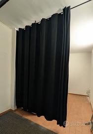 Tenda fonoassorbente fonoisolante - Materiale: 80% cotone riciclato e 20% viscosa - Ignifuga ai sensi della norma DIN 4102 B1 - Qualità: 500 g/m² - Dimensioni (L x A): 4 x 3 m (L = bordo con occhielli) - Peso: ca. 7,6 kg - Colore: nero - Bordo superiore con fettuccia cucita e occhielli bruniti - Bordo sinistro/destro: con orlo sottile - Bordo inferiore: bordo vivo - Distanza tra gli occhielli: 25 cm - Diametro interno dell'occhiello: circa 18 mm